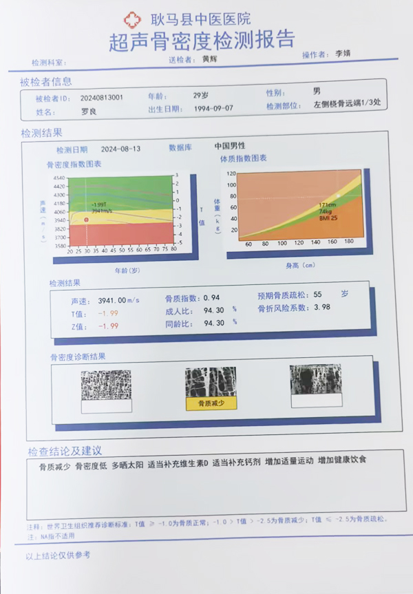 骨密度檢測是評估骨骼健康狀況的重要方法,對于早期發(fā)現(xiàn)骨質(zhì)疏松、預(yù)測骨折風(fēng)險、監(jiān)測治療效果等具有重要意義。以往,患者需要前往上級醫(yī)院或?qū)I(yè)機構(gòu)進行骨密度檢測,不僅費時費力,還可能延誤病情。此次耿馬縣中醫(yī)醫(yī)院引進的品源醫(yī)療超聲骨密度檢測儀,具備多部位測量(橈骨、脛骨)和多傳感器探頭的技術(shù)優(yōu)勢,能夠?qū)崿F(xiàn)對不同年齡段人群的全面檢測。其內(nèi)置的少年兒童數(shù)據(jù)庫(0-12歲)、青少年數(shù)據(jù)庫(12-20歲)、成年人數(shù)據(jù)庫(20-80歲)、老年人數(shù)據(jù)庫(80-100歲),使得檢測結(jié)果更加貼合不同人群的實際情況。