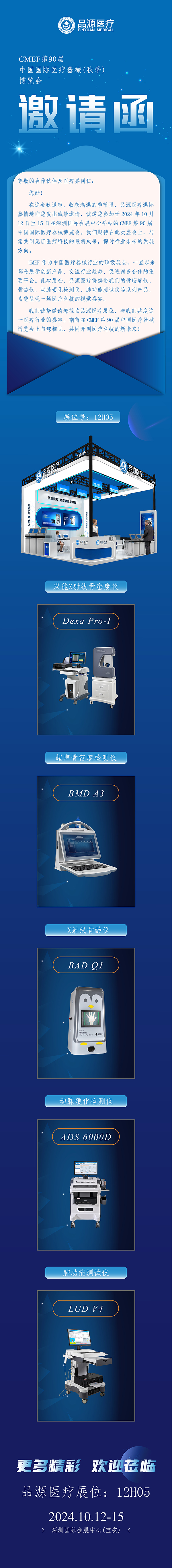 CMEF 作為中國醫(yī)療器械行業(yè)的頂級展會,一直以來都是展示創(chuàng)新產品、交流行業(yè)趨勢、促進商務合作的重要平臺。此次展會,品源醫(yī)療將攜帶我們的骨密度儀、骨齡儀、動脈硬化檢測儀、肺功能測試儀等系列產品,為您呈現一場醫(yī)療科技的視覺盛宴。我們誠摯邀請您蒞臨品源醫(yī)療展位12H05,與我們共度這一醫(yī)療行業(yè)的盛事。期待在 CMEF 第 90 屆中國醫(yī)療器械博覽會上與您相見,共同開創(chuàng)醫(yī)療科技的新未來!
